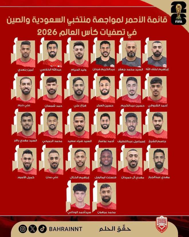 随着比赛的临近,巴林国家队公布了世预赛18强赛最后两轮的大名单,他们将分别对阵沙特和中国队。这份25人名单中,门将位置由卢特法拉、贾法尔和法尔丹三人组成,均来自本土联赛穆哈拉克和里法俱乐部。后卫线以穆哈拉克球员为主力框架,瓦利德·哈亚姆、贝纳迪领衔,辅以哈利迪亚和里法俱乐部的多名球员,防线配置呈现明显的本土化特征。